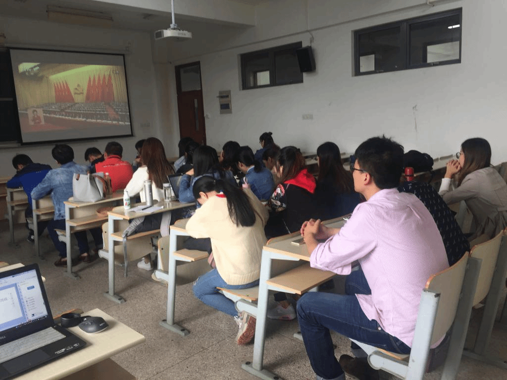 中国共产党第十九次全国代表大会与2017年10月18号上午9:00在直播人民大会大礼堂开幕,会期10月18日至10月24日。江南大学马克思主义学院研二同学在第二教学楼A419观看党的十九大开幕会。同学们为了迎接党的十九大的胜利召开,早早来到教室观看视频记录我们国家发展的关键时刻。观看期间,同学们认真观看党的十九大开幕会,一方面对国家取得成就赞叹不已,一方面为自己身为这个有担当有气魄的大国中的一员深感骄傲。对于党的十九大开幕会中提到的对感兴趣的内容,同学们做好笔记,从而可以深刻理解党的十九大的内涵及意义。同学们认为党的十九大是我们的精神盛会,为社会主义理论的研究提供前沿的思想与战略,同时能够让我们聆听习近平总书记的高瞻远瞩,开阔自己的学术视野。