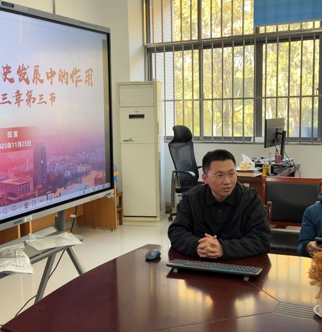 备课会伊始,田重老师以“人民群众在历史发展中的作用”为题进行教学展示。他系统阐述了马克思主义坚持群众史观的三个理论依据:从现实的人及其本质出发,指出人民群众是历史的创造者;从整体社会历史过程考察,强调人民群众始终发挥决定性作用;从历史发展必然性角度,论证了人民群众是推动社会前进的根本力量。陈永杰教授在点评中肯定了教学展示的理论深度,在此基础上,陈教授补充指出,唯心史观的根本错误在于将历史发展归结为少数英雄人物或神秘力量的作用,忽视了人民群众的创造力量。同时他强调,唯物史观在强调物质生产基础性作用的同时,并没有否认精神因素的能动作用。