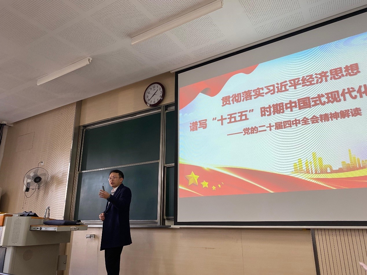 李兆丰副校长结合《贯彻落实习近平经济思想 谱写“十五五”时期中国式现代化新篇章》专题内容,强调新时代大学生学习思政课要紧扣“知情”“善析”“笃行”三大核心要求,将理论认知转化为行动自觉,真正实现思政育人的内化与践行。“知情”即要求大学生主动关注时政热点与政策动向,通过课堂学习、权威媒体、社会实践等渠道,系统了解党的创新理论、国家发展战略及国际局势变化,筑牢思想根基。“善析”要求大学生学会运用马克思主义立场观点方法,在复杂问题中厘清逻辑,穿透现象看本质。“笃行”要求大学生在知行合一中担当使命,厚植家国情怀,在服务社会中实现价值。在课堂的尾声,李兆丰副校长以“心中有数、肩上有责、脚下有路”十二字寄语勉励学生们,努力为新时代贡献青春力量。