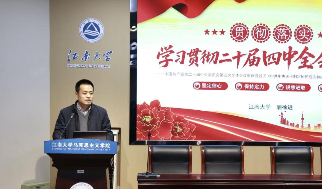 为深入学习宣传贯彻党的二十届四中全会精神,引导学院教职工深刻领会、准确把握全会精神,12月24日,马克思主义学院举行学习贯彻党的二十届四中全会精神宣讲报告会,江南大学党委宣讲团成员、商学院院长浦徐进教授作专题报告。学院党政领导班子成员、全体教职工参加报告会。报告会由马克思主义学院院长侯勇主持。