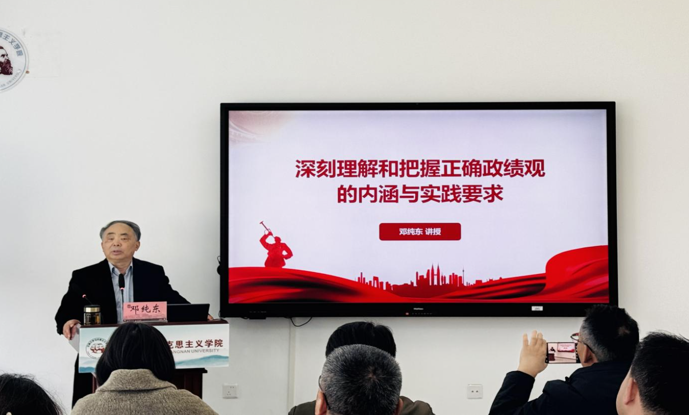 3月12日下午,学院在文科楼407会议室举办院党委理论学习中心组(扩大)学习会议暨“奋进大讲堂”,紧扣学习教育主题,扎实开展专题学习。第十三届全国政协委员、中国社会科学院马克思主义研究院原党委书记、院长邓纯东作题为“深刻理解和把握正确政绩观的内涵与实践要求”的专题辅导报告。学院领导班子及党委委员、师生党支部代表等参加报告会,会议由杨飏主持。