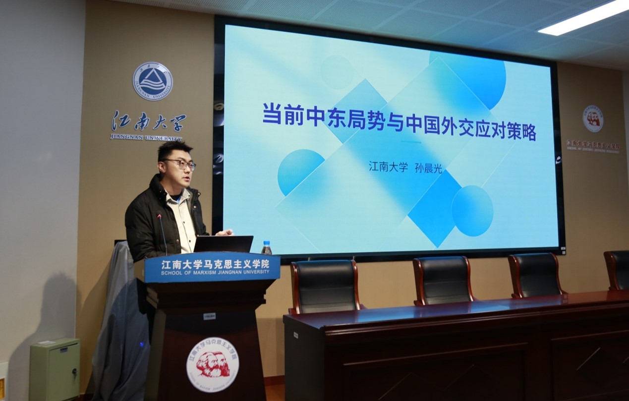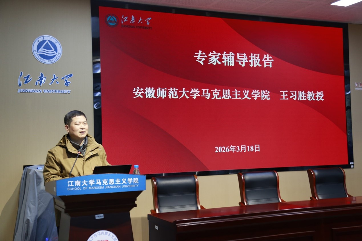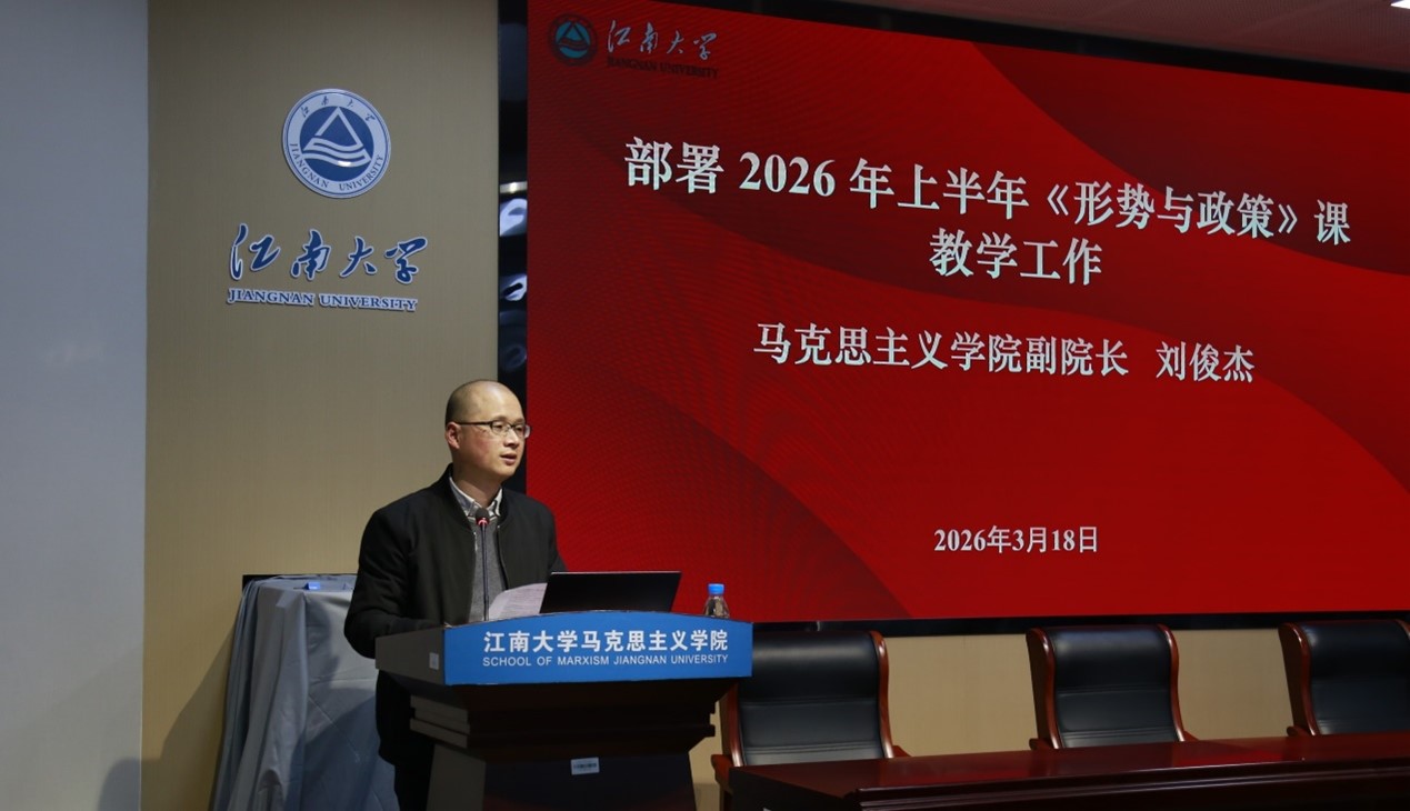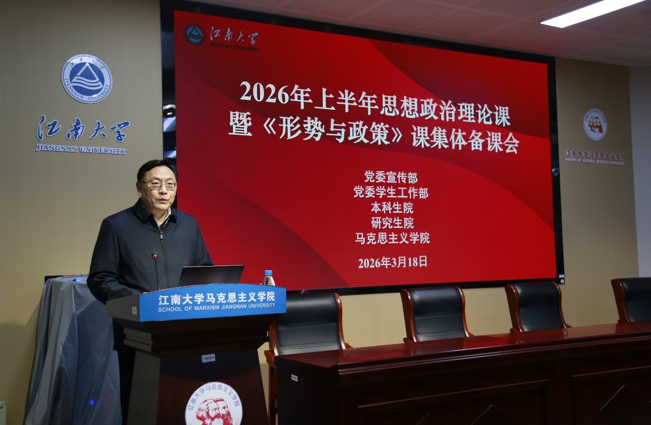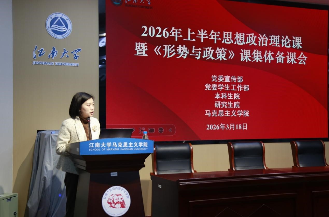 本次备课会分两阶段进行。第一阶段为思想政治理论课集体备课会,特邀国家教学名师、安徽师范大学马克思主义学院王习胜教授作专题辅导。王习胜围绕当前思政课教学中的热点难点问题,结合学生现实关切,进行了深入浅出的讲解,为与会师生提供了理论指导和实践启示。随后,学校教务处副处长陈献忠从思政教学质量提升攻坚、思政教师队伍赋能行动、“大思政课”提质增效等方面,详细解读了《江南大学2026-2027年思政课课堂质量提升行动方案》。在第二阶段,马克思主义学院副院长刘俊杰就2026年上半年《形势与政策》课教学工作进行了专项部署。青年教师朱明明、孙晨光分别以《奋进“十五五” 勇于挑大梁——深入学习贯彻习近平总书记参加江苏代表团审议时的重要讲话精神》、《当前中东局势与中国外交应对策略》为题进行了示范教学。