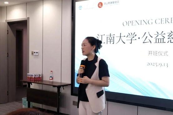 在开班仪式上,郑丹丹介绍了公益慈善微专业开设的目的、意义和筹建的过程。她指出公益慈善微专业依托江南大学思想政治教育、社会工作、法学等相关专业,与中国灵山公益慈善促进会和灵山慈善基金会密切合作,整合校内外资源,促进多学科深度交叉融合,在特色课程、人才培养模式、实践创新及资源筹集等方面进行持续探索,打造“思政红专并进+公益慈善组织”的人才摇篮,旨在培养学生的批判性思维、综合分析、跨界融合和学以致用的能力,帮助学生拓宽知识视野,拓展未来发展途径,提升社会适应能力。她对王文理事长和各位老师为微专业的建设发展付出的辛勤努力表示感谢,希望首届学生能主动积极投入到新专业的学习中,在教学实践中开阔眼界,激发潜能,争取为中国公益慈善事业做出自己的贡献。