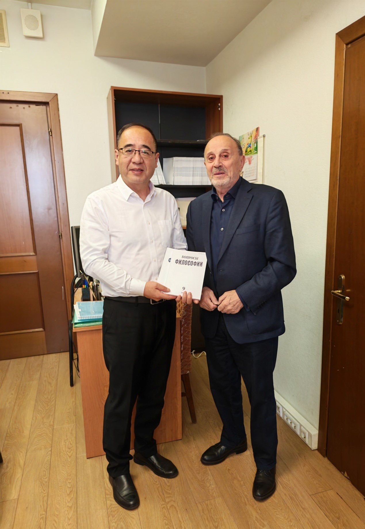 俄罗斯科学院哲学研究所自然科学哲学研究室主任、《哲学问题》杂志主编鲍里斯·普鲁日宁(Борис Исаевич Пружинин)教授亲切会见了万长松教授一行并互赠礼物。万教授向普鲁日宁教授详细地介绍了江南大学的位置、规模和教学科研情况,特别是自2021年国家社科基金重大项目立项以来取得的进展和存在的问题,普鲁日宁教授深感兴趣并对中国学者所做的工作表示敬意。他详细介绍了俄罗斯科学院哲学研究所的发展历史、取得的成就。特别指出早在苏联时期,哲学研究所在科学哲学、逻辑学等领域就取得了世界级的研究成果,涌现出凯德洛夫、科普宁、伊里因科夫、季诺维耶夫、列克托尔斯基等一批优秀的科学哲学家,带动了20世纪60年代苏联科学哲学的兴起和认识论转向。会谈结束以后,普鲁日宁教授还带领万教授一行参观了哲学研究所档案馆并赠送了最新出版的著作和杂志。